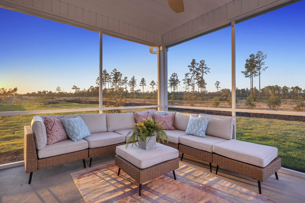 - Extended outdoor living space that includes a screened-in patio and additional patio for grilling or firepit.