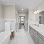 - Spacious zero entry tile shower and freestanding soaking tub in the primary bathroom
